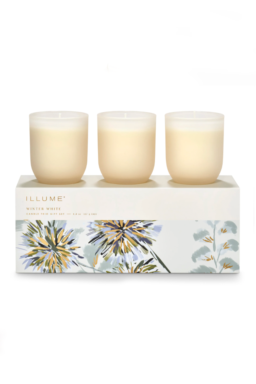 Three frosted glass candles sit inside a beautiful box with hand painted art and pops of gold foil.