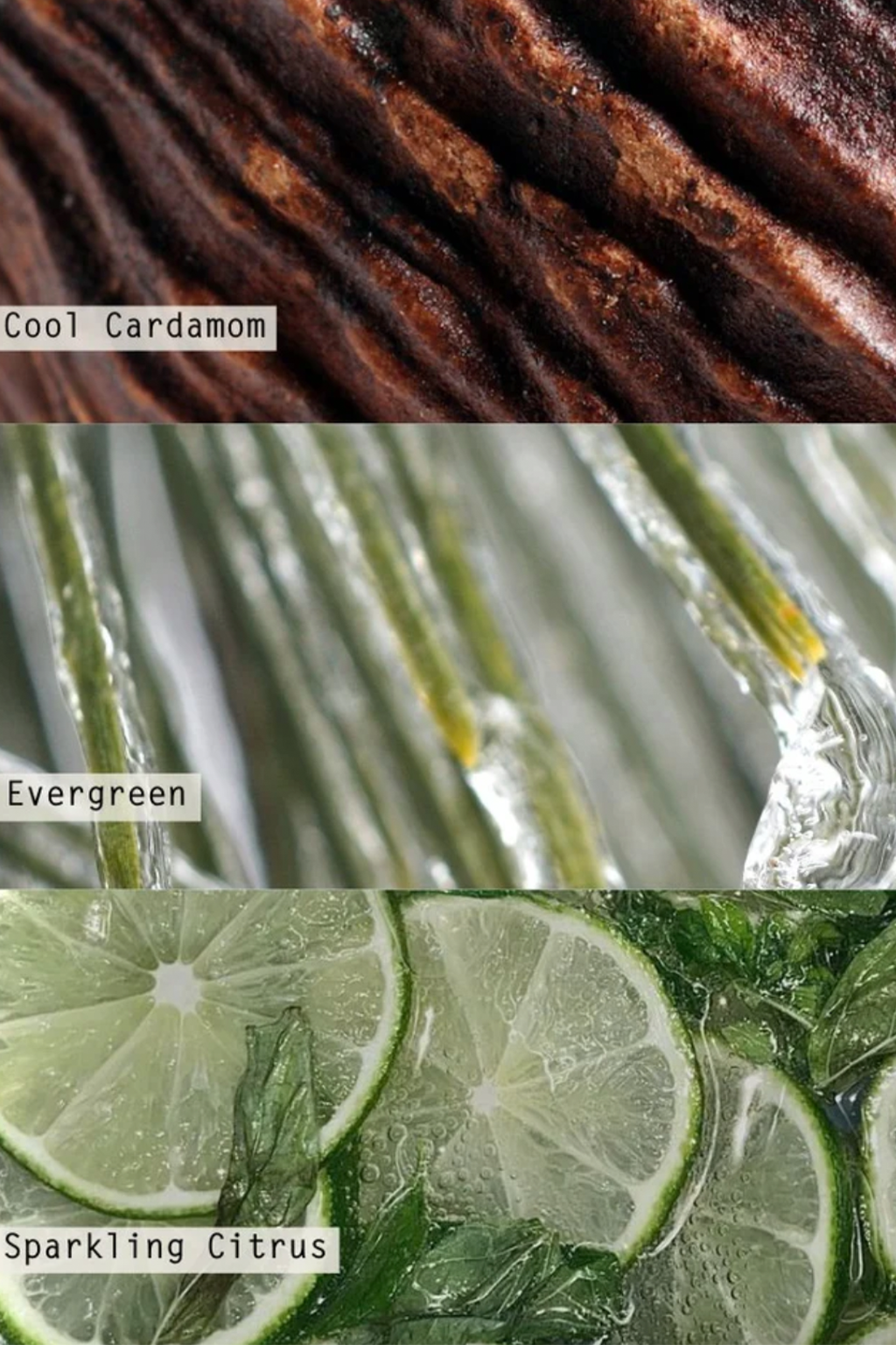 Grounded in cool cardamom with a heart of evergreen kissed with sparkling citrus.