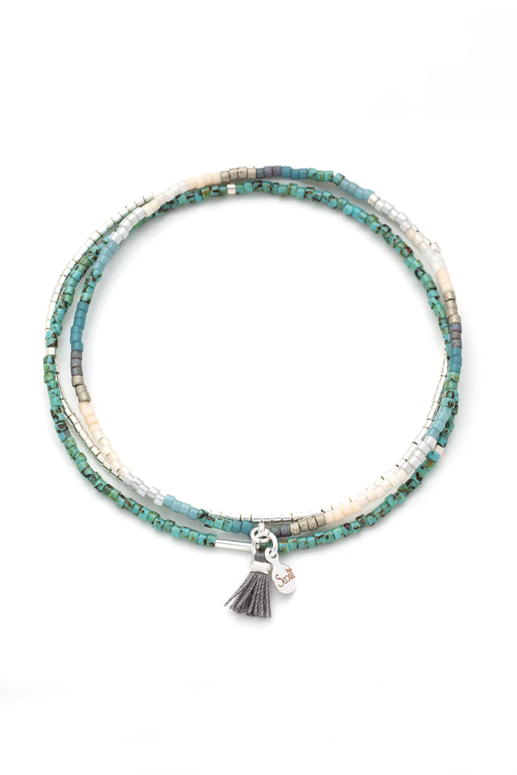 - Materials: Miyuki Delica beads, plated brass beads, semi precious stone, rhinestone charm with Scout logo & stretch cord.