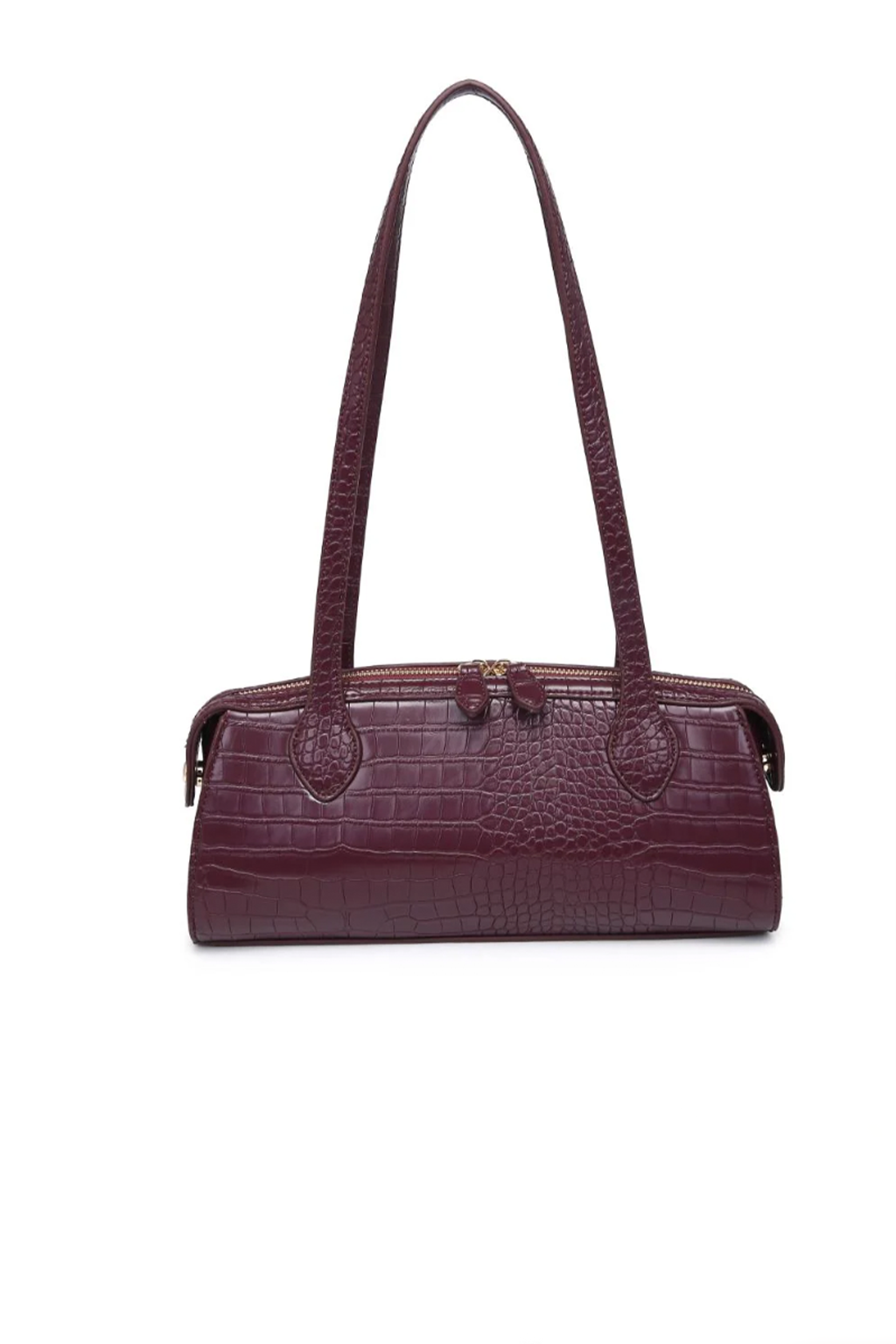 - Exterior Details: Gold Hardware, Croc Print, Dual Shoulder Straps, Pull Tabs