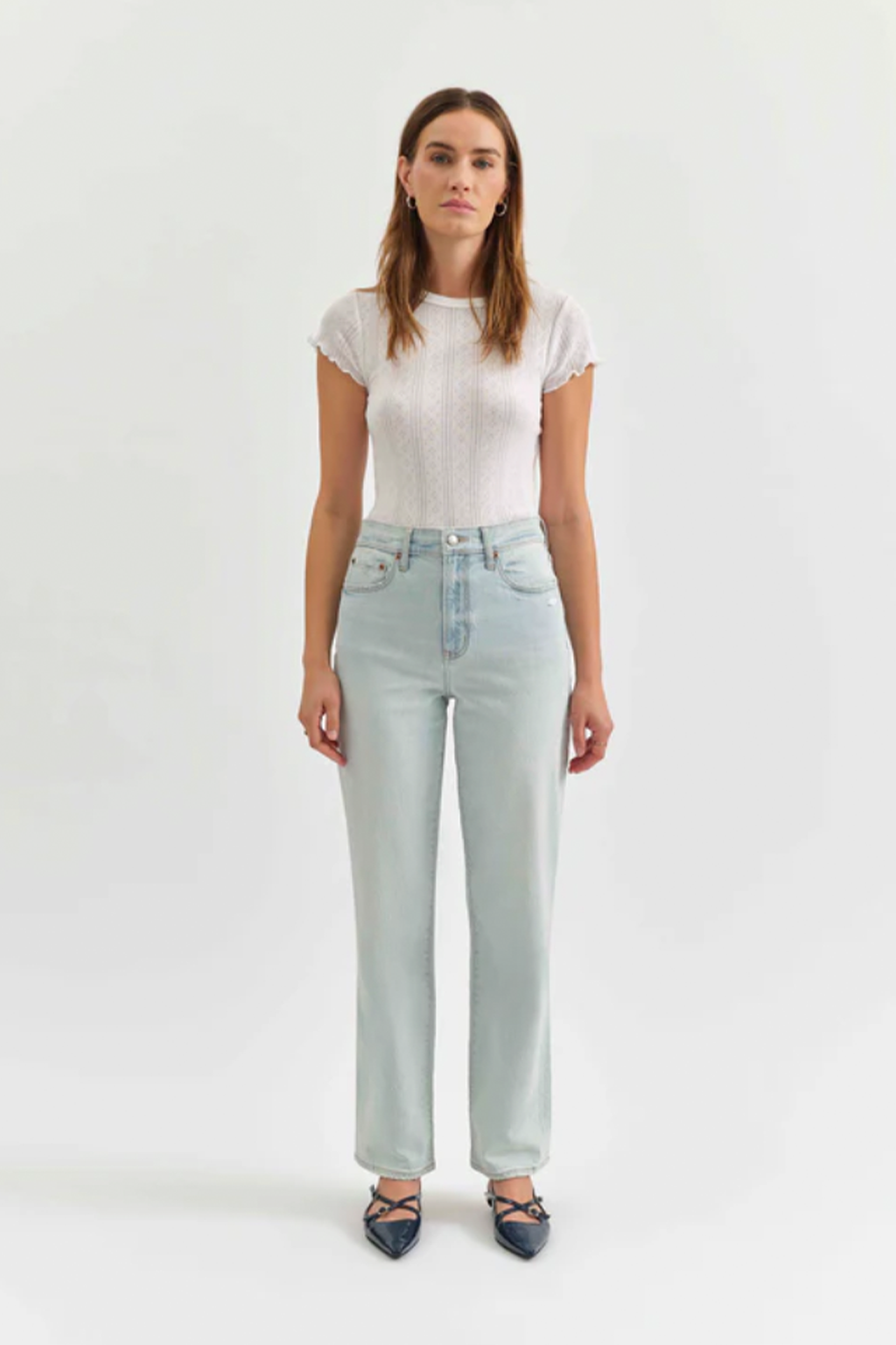 The Sundaze in Lost Love is a vintage-inspired high rise straight leg in a light blue wash. This vintage-inspired jean is constructed from our Tough Love fabric, which is mostly rigid but yields to your body in all the right ways.