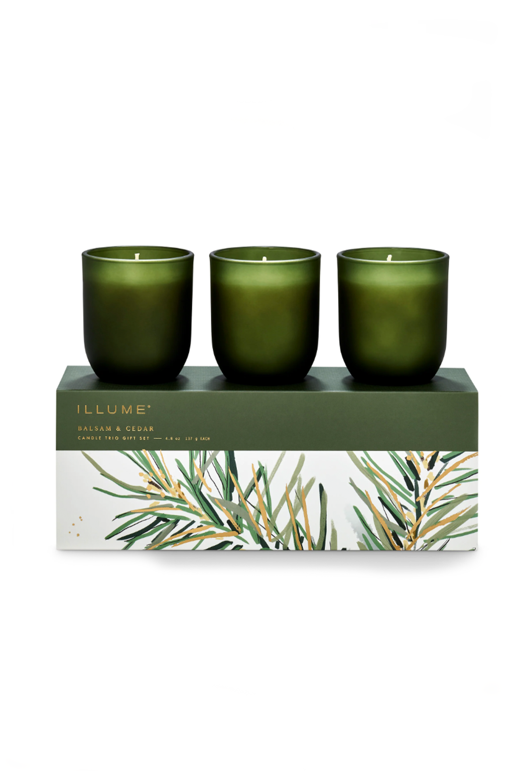 Three frosted glass candles sit inside a beautiful box with hand painted art and pops of gold foil.