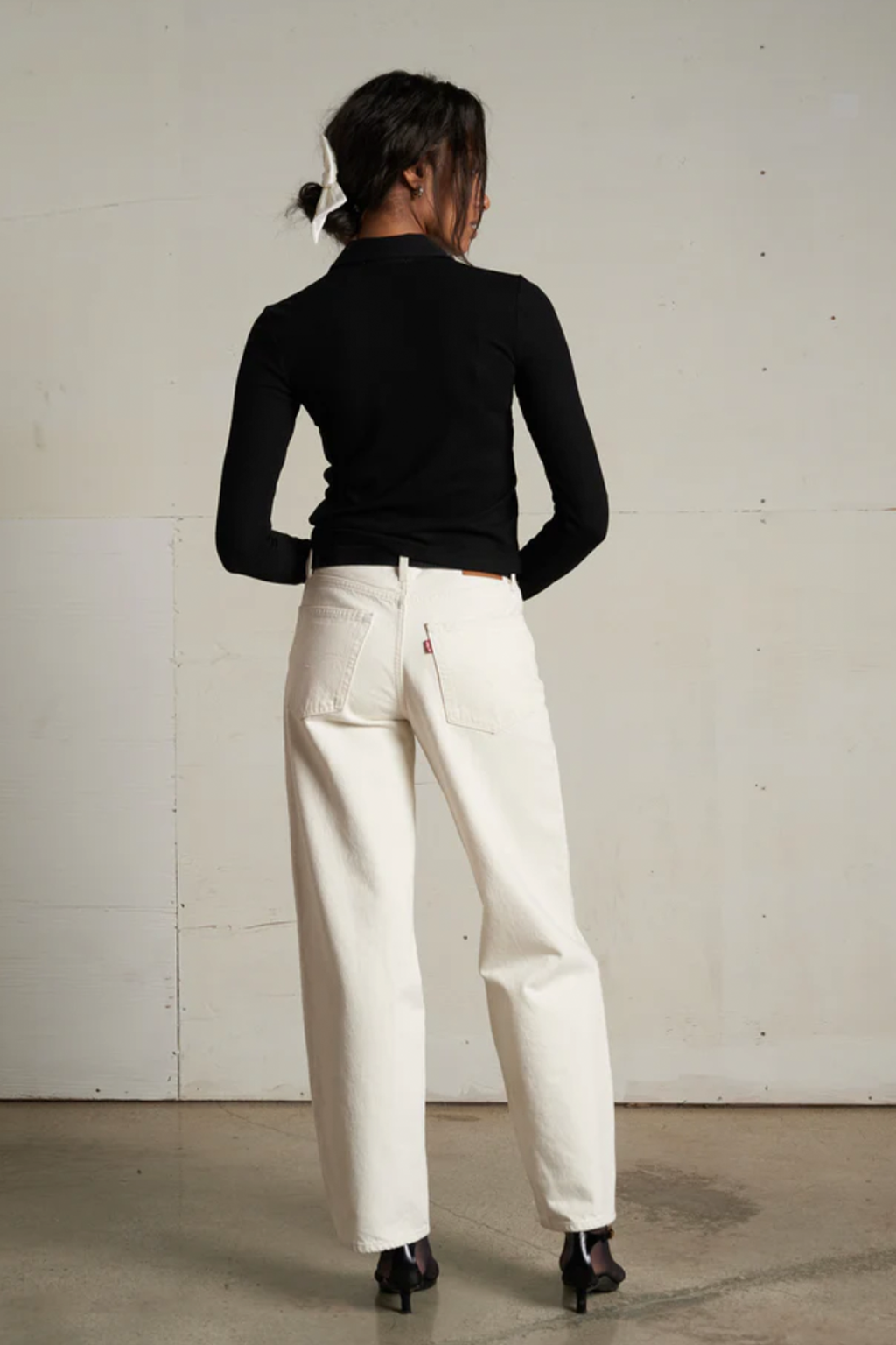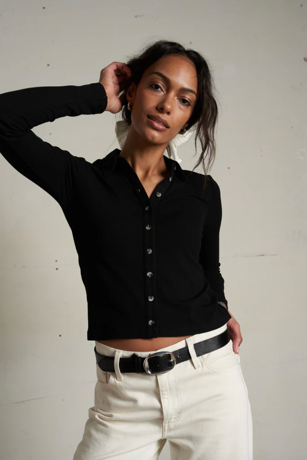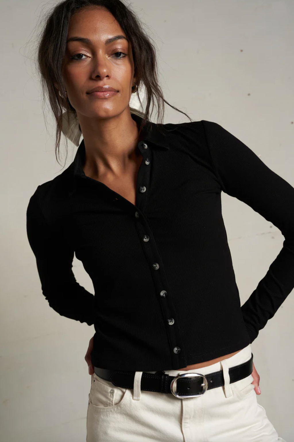 the amee top is a luxe rib essential with a polished twist. fitted through the body with a full button-down front and soft collar, this one sits right at your belly button for that just-right proportion. wear it open over a tank or buttoned all the way up, she’s made to style both ways.