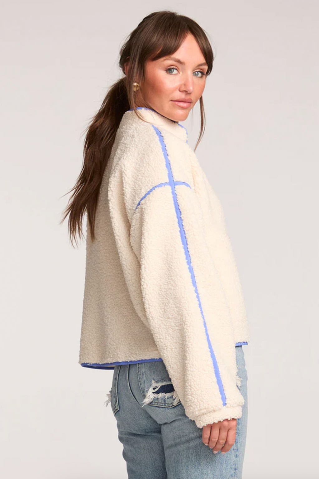 Crafted from soft salt fabric, it is elegantly accented with light blue piping along the sleeves, shoulders, and lapels for a refined and sophisticated look.