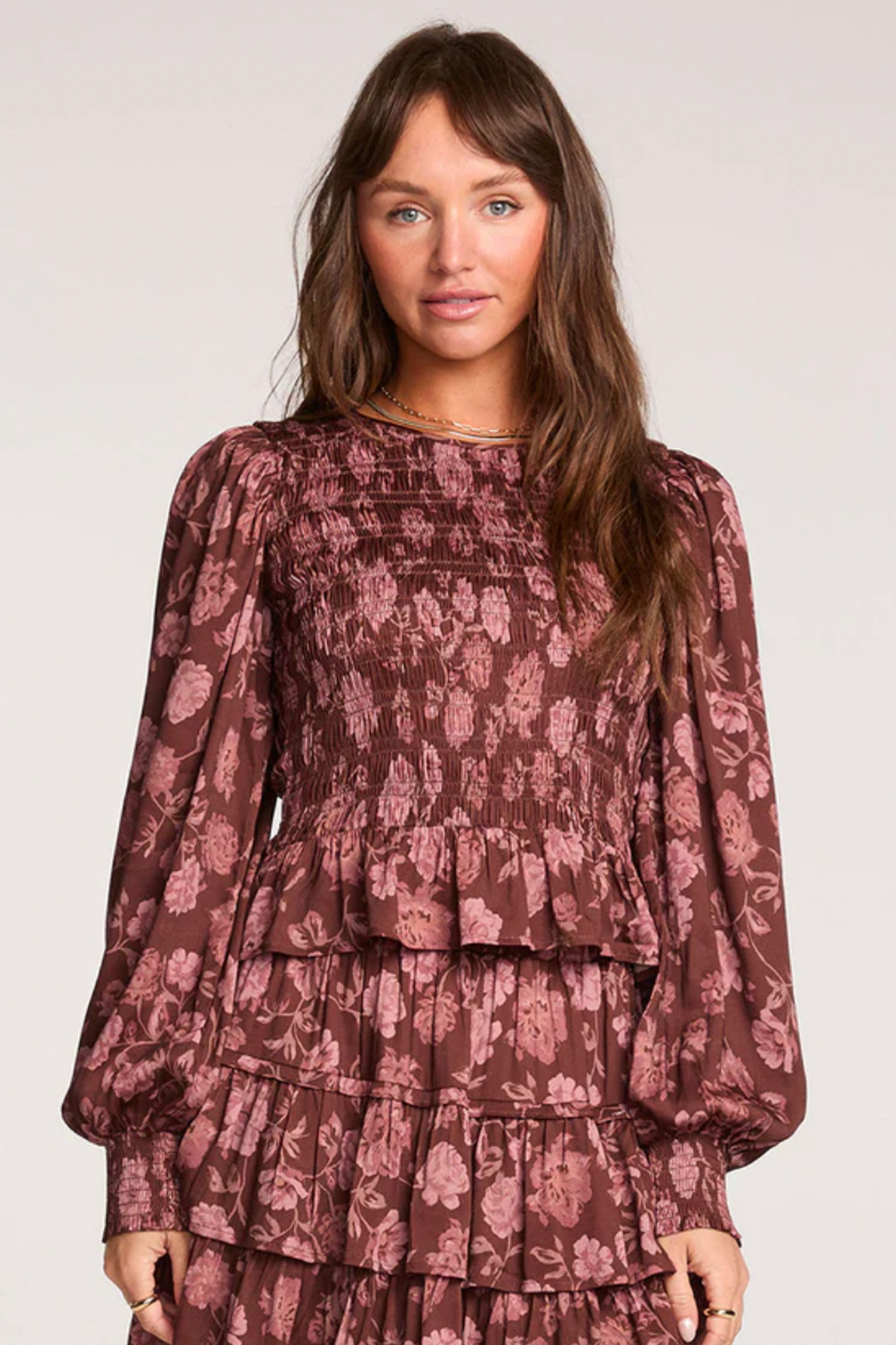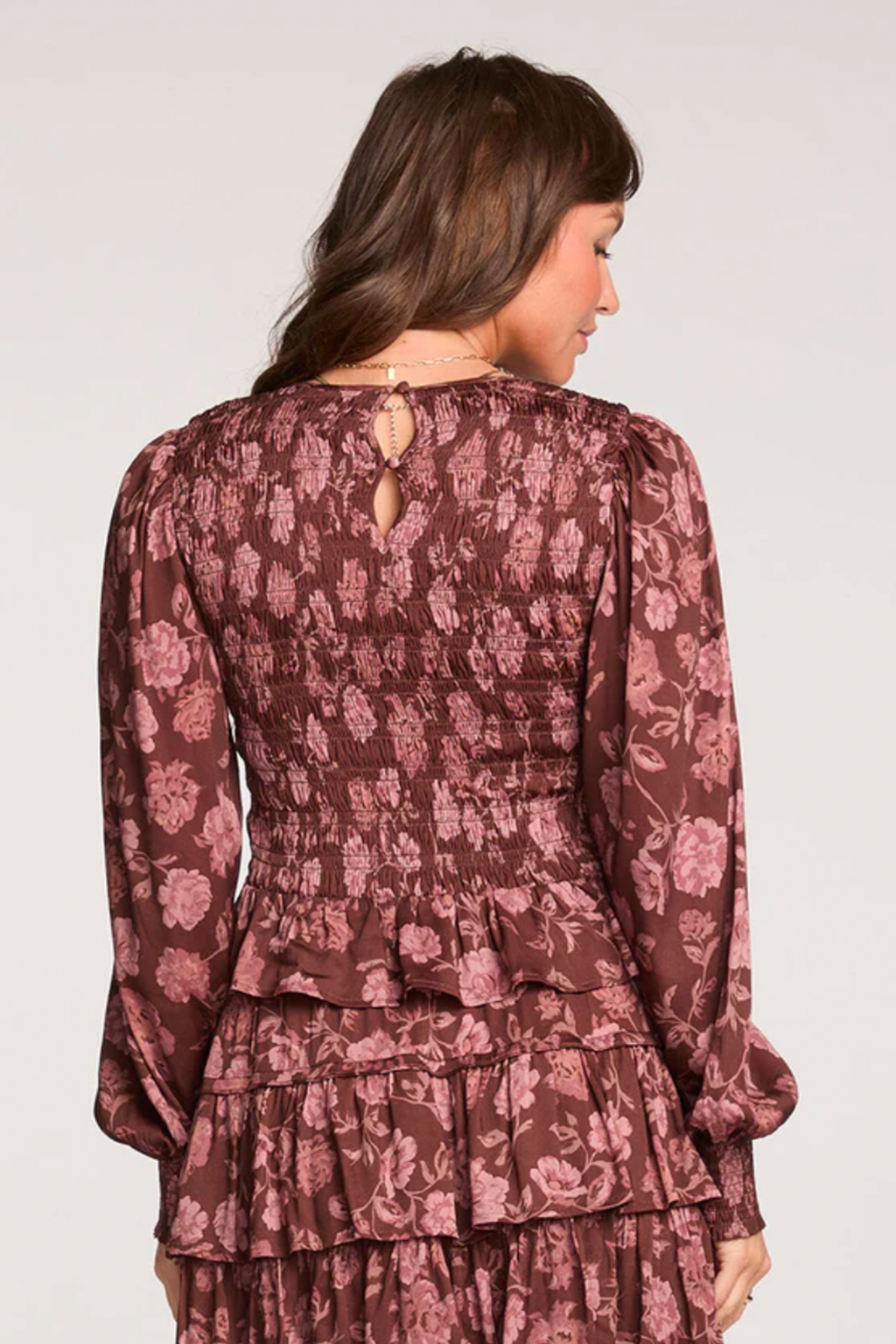 Its dramatic gigot sleeves add a touch of vintage romance, enhanced by a soft pink botanical pattern.