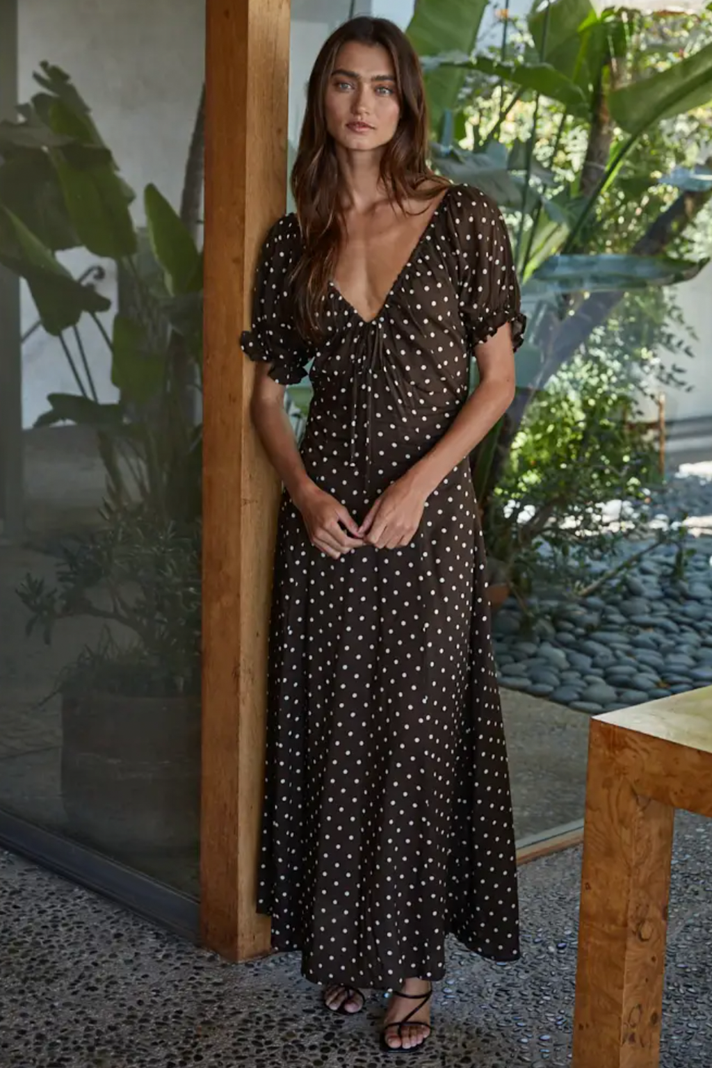 Woven Rayon Polyester Polka Dot Print V-Neck Short Sleeve Flare Long Dress with Front Tie Strap and Rayon Lining