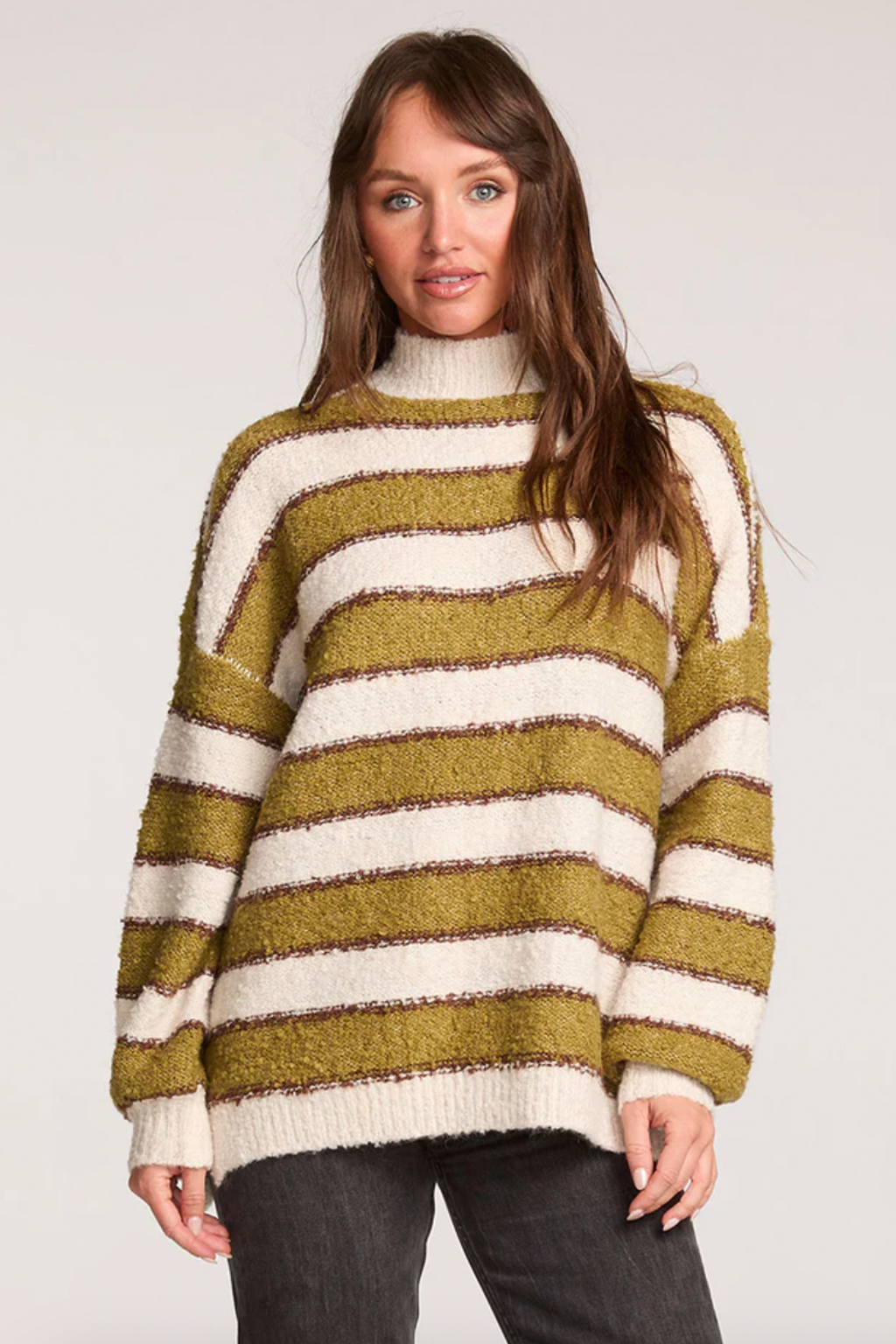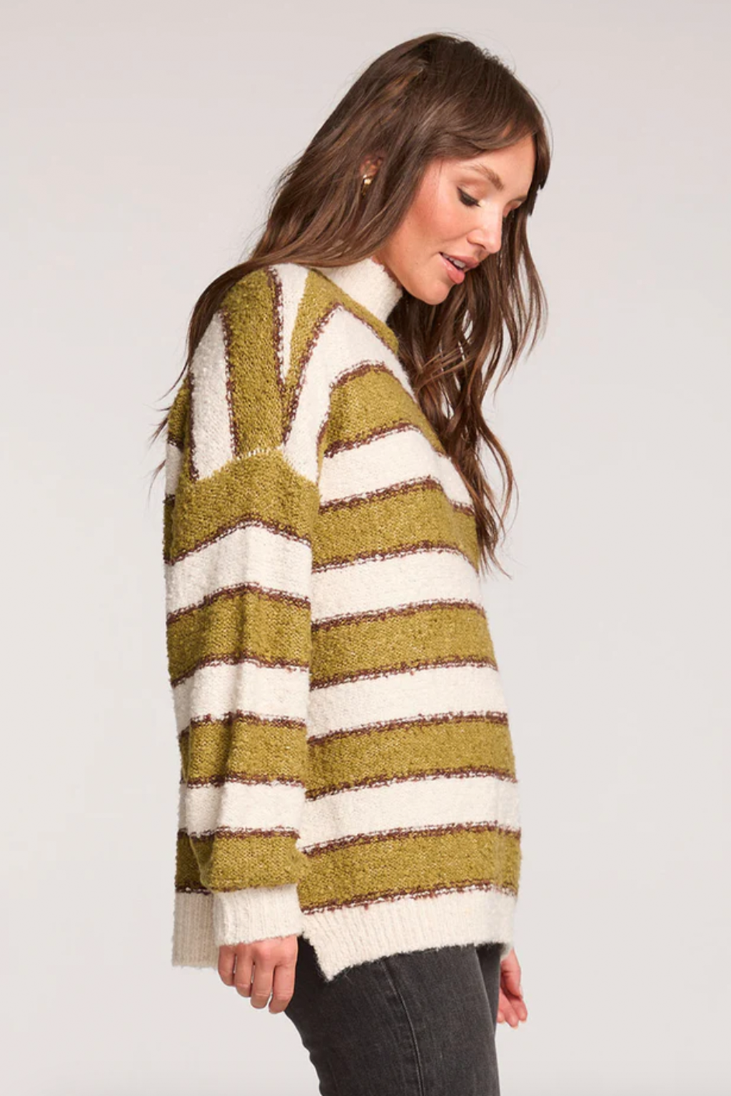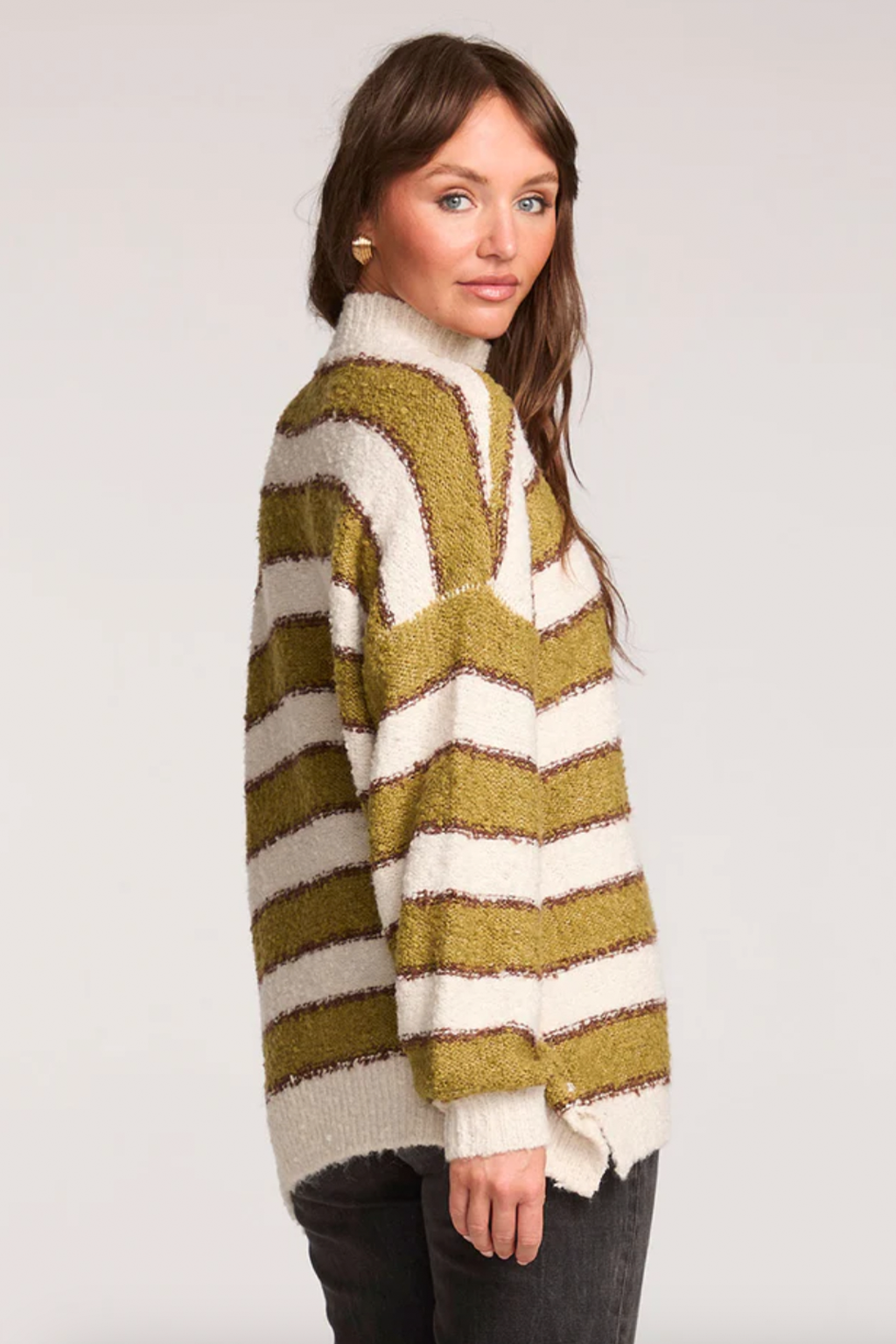 The Rowann Fern Sweater features an oversized body and roomy sleeves with gathered cuffs, delivering cozy comfort with a slight turtleneck.